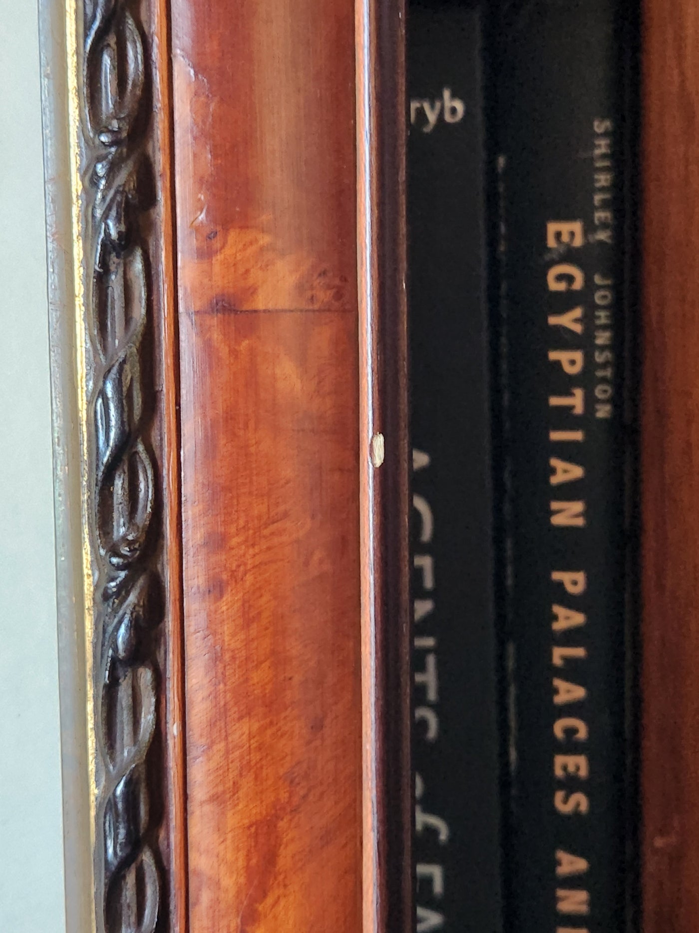 Note on the frame: Unlike most of our other pictures, this is in its original frame. It looks like burr walnut veneer over hardwood, embellished with a gilt inner moulding, and finished with shellac. The French matting also includes gold. Replacing all of it didn’t seem right given the style and quality. The frame isn’t all that old. The condition is good, but it does show the kind of mild wear typical of a vintage item. It may not suit some interiors, but if you’re looking for something clubby, bibliothecal, or outright manorial, this is for you!