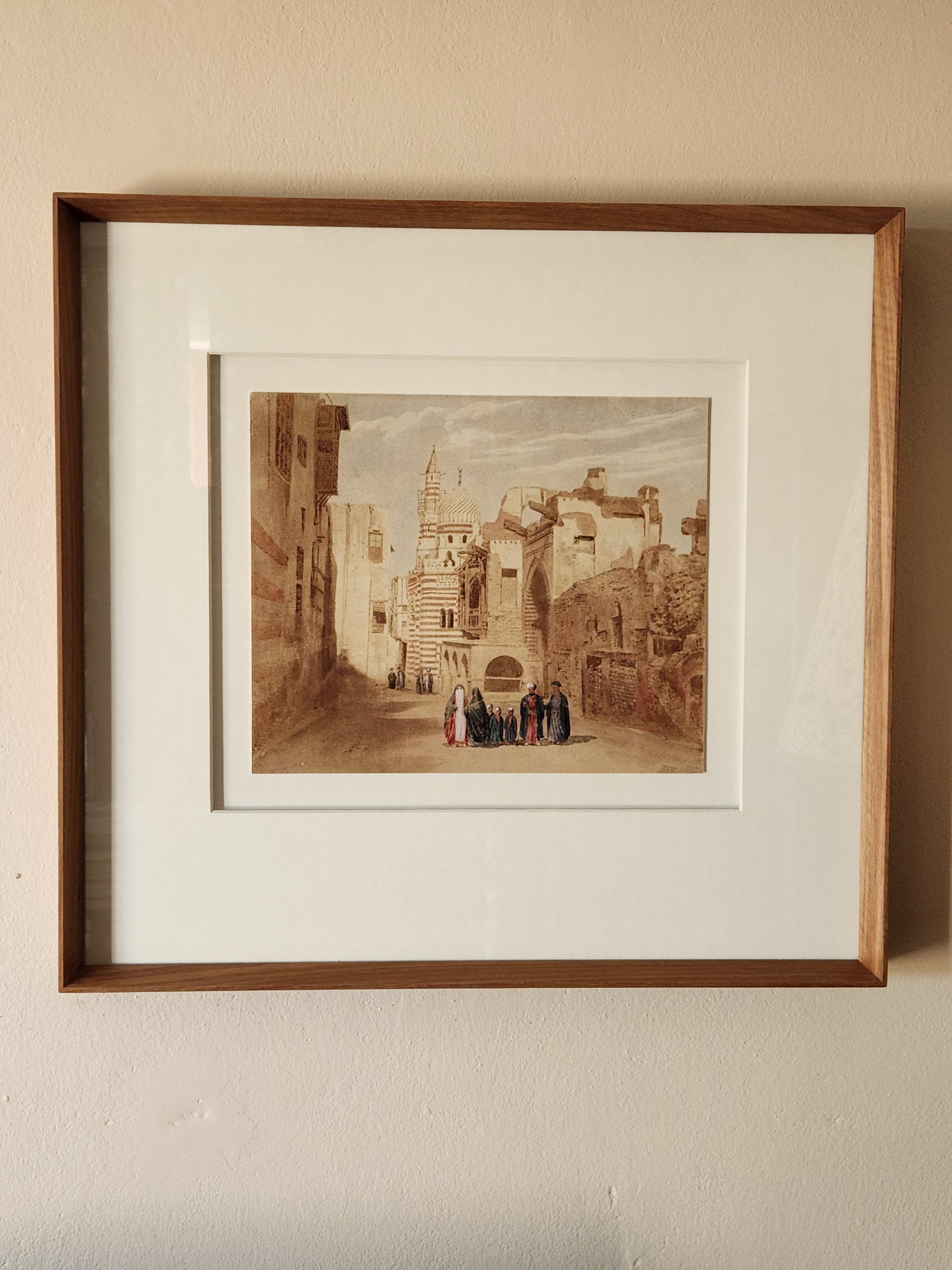 This is not, though, a painting in the traditional sense: it’s a photographic print on paper overpainted with watercolour and gouache. The Scottish engraver and photographer James Robertson produced work like this in the 1850s, mostly in Constantinople, but he travelled widely and visited Cairo – and this street – in 1857 with his brother-in-law and fellow photographer Felice Beato (1832–1909).